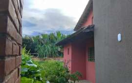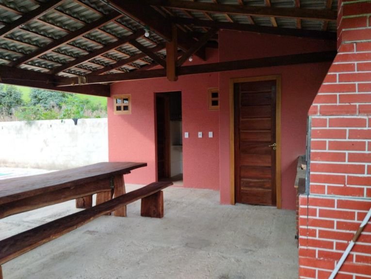 Com um lindo rio nos fundos da chácara;